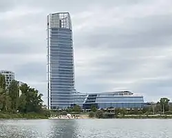 In 2017, MOL announced the relocation of their corporate headquarters, which are currently based in various buildings throughout Budapest.[68] The complex consists of a 120m tower, connected podium, buildings and outside spaces, which are designed by Foster + Partners.[69] The campus also entails a public "sky deck" and has state-of-the-art sustainability features, including responsive lighting, heating and ventilation systems, low-carbon energy sources and rainwater harvesting and storage facilities.[70] The campus spans 86,000 sqm at the bank of the Danube and accommodate up to 2,500 people. The tower is the Budapest's highest building and make it the second city in the CEE region to display a building by the British studio.[71]