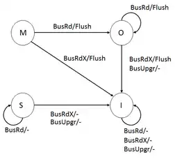 While in the Owner (O) state and there is a snooped read request (BusRd), the block remains in the same state while flushing (Flush) the data for the other processor to read from it. With a snooped write request (BusRdX), the block changes state to invalid (I) along with flushing (Flush) the data as another processor is writing to it, thereby losing its ownership on that block. Whenever another processor tries to access that block, instead of going to the memory to access it, the processor takes it from other cache which already has that block in the owned (O) state. With a BusUpgr, it just changes the state from owner (O) to invalid (I).[3]