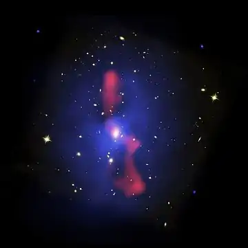 Using data from the Chandra X-ray Observatory, scientists have deduced that an eruption has been occurring for the last 100 million years at the heart of the galaxy cluster, releasing as much energy over this time as hundreds of millions of gamma ray bursts.[2] (The amount of energy released in a year is thus equivalent to several GRBs.) The remnants of the eruption are seen as two cavities on either side of a large central galaxy. If this outburst, with a total energy budget of more than 1055 J, was caused by a black hole accretion event, it must have consumed nearly 600 million solar masses. Work done by Brian McNamara et al. (2008) point out the striking possibility that the outburst was not the result of an accretion event, but was instead powered by the rotation of the black hole. Moreover, the scientists mentioned the possibility that the central black hole in MS 0735.6+7421 could be one of the biggest black holes inhabiting the visible universe. This speculation is supported by the fact that the central cD Galaxy inside MS 0735.6+7421 possess the largest break radius known, as of today. With a calculated light deficit of more than 20 billion solar luminosities and an assumed light-to-mass ratio of 3, this yields a central black hole mass much above 10 billion solar masses, as far as the break radius was caused by the merger of several black holes in the past. In combination with the gargantuan energy outburst it is therefore very likely that MS 0735.6+7421 hosts a supermassive black hole in its core. The cluster has a red shift of 64,800 ± 900 km/s and an apparent size of 25′.[4]