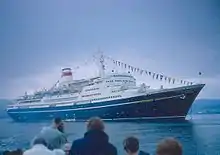 Aleksandr Pushkin entered service in 1965 with the Baltic Shipping Company, one of the three principal Soviet passenger shipping companies (the other two being the Black Sea Shipping Company and the Far Eastern Shipping Company).[1][14] Reports about her service in the Soviet fleet are fragmentary and conflicting, partly due to some information still being classified by the Russians. Most sources state she was used to inaugurate the Baltic Shipping Company's regular trans-Atlantic service between Montreal, Quebec, Canada and Leningrad, and later on used for cruising.[4][9][16][19] Other sources give a more detailed, but somewhat conflicting, accounts. Philip Dawson's book The Liner - Retrospective & Renaissance gives the full route as Leningrad—Helsinki—Copenhagen—London (Tilbury)—Quebec City—Montreal, in addition to which the ship was used for cruising from Montreal to Saint Pierre and Miquelon, The Bahamas and Cuba during the summer months. According to the book, the ship carried just 36 passengers on her first transatlantic crossing.[15] According to Cruisepage.com, she spent only the summer months on Leningrad—Montreal service, while the rest of the year she was used either on crossing from Leningrad to Havana, Cuba or cruising under charter to western companies.[14] Fakta om Fartyg offers a somewhat different account, stating that the ship originally entered service as a cruise ship in 1965, moving to the Leningrad—Montreal route in only April 1966, then spending summers from 1967 until 1979 in Leningrad—Bremerhaven—Montreal route and the rest of the year cruising, and from 1979 exclusively on cruise traffic.[1] It does seem likely the ship called in Helsinki and London on her transatlantic crossings, as according to an article in Helsingin Sanomat Alexandr Pushkin was popular amongst Finnish passengers sailing to London and Canada; she was the only ship offering crossings from Finland to Canada and the only liner in Helsinki—London service at the time.[19] Although not mentioned in any source, photographic evidence shows that Aleksandr Pushkin's superstructure was enlarged during her 1972 rebuilding, with the forward superstructure expanded and rear promenade decks built in.[4]