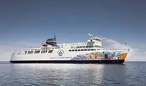 A trip aboard Chi-Cheemaun is a long standing Great Lakes tradition dating back to the 1930s when a small, wooden vessel, Kagawong, first ferried vehicles across the Georgian Bay between Tobermory and South Baymouth.[1] It features a drive-on, drive-off bow and stern loading and unloading through a visored bow system and a square door stern section. The ship is 111 m (364 ft 2 in) long with a 19 m (62 ft 4 in) beam and has capacity for 648 passengers and 143 vehicles, including room for large highway vehicles such as buses and transport trucks.
