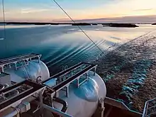 Viking Grace is the most environment-friendly of all large cruiseferries. She uses liquefied natural gas (LNG) as fuel, making emissions to the air minimal.[10] The emissions of LNG include hardly any sulphur dioxide (SO2) or small particles. Also nitrogen oxide (NOx) emissions are reduced by 90% and carbon dioxide emissions by 20% compared to use of fuel refined from oil.[11] The ship also uses a new kind of marine gas oil (MGO)[6] until the LNG terminals have been completed.[12] The intent is to be able to refuel the ship with LNG from both Turku and Stockholm. The ship can travel two to three days with one refuelling.[6] Also the ship's wave forming and noise have been kept to a minimum as it has been designed to travel in an archipelago.[10]