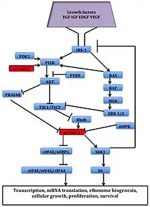 Downstream, the mTOR effectors S6 kinase 1 (S6K1), eukaryotic initiation factor 4E-binding protein 1 (4EBP1) and eukaryotic initiation factor 4E (eIF4E) are related to cellular transformation.[1] S6K1 is a key regulator of cell growth and also phosphorylates other important targets. Both eIF4E and S6K1 are included in cellular transformation and their overexpression has been linked to poor cancer prognosis.[16]