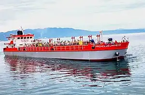 MT Princess Empress, the oil tanker that caused the oil spill, is owned by RDC Reield Marine Services.[8][9] Before it sank, the oil tanker was crewed by 20 people and en route to Iloilo to transport 900,000 liters (240,000 U.S. gal)[lower-alpha 2] of industrial fuel oil from SL Gas Harbor Terminal in Limay, Bataan. According to an energy sector source, industrial fuel oil, also known as "black oil", is "highly toxic to the environment".[10]