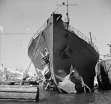 Off Cap Bon on 12 August a Luftwaffe aircraft launched an aerial torpedo at Brisbane Star. It damaged her bow, almost tearing it off, but she stayed afloat.[4] She could make only 3 knots (5.6 km/h), so she rounded Cap Bon and anchored in the Gulf of Hammamet. There the harbour master of Sousse in Vichy French Tunisia boarded the ship, declared her unseaworthy and ordered her to be detained and enter port. Brisbane Star's Master, Captain Frederick Riley, refused and the harbour master eventually withdrew.[5]
