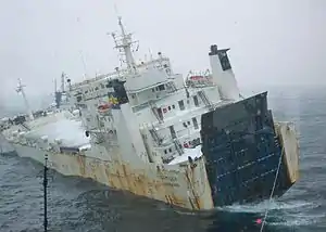 On May 1, 2002, Camilla was laid up in the port of Mariehamn, Finland. According to the Finnish investigation report, maintenance work on the ship was intended to be carried out during the lay-up, but did not actually take place. On December 31, 2002 the ship departed Mariehamn for Canada in ballast for a cargo of paper. During the sailing, it was noticed that the ship's fuel had been contaminated with water, requiring a transition to burning light oil, and that engine lubrication oil required continuous filtering. The exhaust valves of the main engine also saw attention many times during the trip. After loading her cargo in Dalhousie, New Brunswick, Canada, the ship left for England on January 19, 2003. On Jan 23rd 05:40z the main engine stopped at sea, causing a black out. The engine failed with alarms and was restarted several times each time with some increasingly worrying signs of disrepair. At 09:36z it was discovered that one of the crank shaft bearings was overheating with mechanical noise emerging from several of the cylinders. At 10:45z the engine was declared inoperative. The engineers initially set out to repair the engine, but the master's decision at 13.48z that the ship would be evacuated halted the work. A hurricane was closing in, the repairs would take up to 36 hours, and even in the best case the ship's propulsion would be limited. The ship was then at 46°54.7′N 46°50.9′W and rolling 30-40 degrees. The crew ate dinner, closed all the hatches and valves and prepared to leave the ship. The ship's Stork-Werkspoor engine type was deemed in the Finnish investigation report to be very sensitive to the quality of its lubrication oil owing to a design feature, and the type had also received a general design revision to the crank rod bearings and the connecting rods. The engine type was also known to collect sticky oily residue in the general crankshaft area even when carefully maintained. The engine on board Camilla had both unrevised and revised parts installed, but the parts to fail were all of the unrevised design. The investigation board concluded that the most probable cause for the engine break down was imperfect lubrication of the main engine.[5] The imperfect lubrication was a result of several factors, as detailed in the full report.