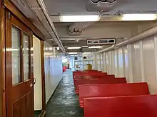 Of drive-through design, Isle of Arran has an open plan car deck with space for 76 cars in five lanes. She is fitted with a bow visor and bow and stern ramps. The open stern allows her to carry tankers and other large vehicles at the same time as passengers. There is insufficient height for lorries and coaches down either side of the car deck due to a gallery deck. From the car deck one must go outside to access the passenger accommodation. On Deck 3 is a sheltered seating area, access to the car deck and passenger lounges, and a luggage area.