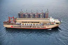 She has a generation capacity of 114 MW on dual-fuel (HFO- and gas-fired). In October 2011, the Powership sailed to Basra, Iraq, where she supplied electricity for about one million residents there in a timespan of three years.[5] Two vessels of the fleet, MV Karadeniz Powership Doğan Bey (126 MW) and MV Karadeniz Powership Rauf Bey (180 MW),[6] were already stationed in Iraq to bridge power shortage.[7]