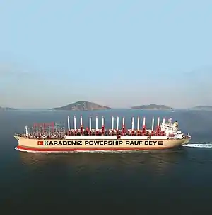 The MV Karadeniz Powership Rauf Bey is a Liberia-flagged Powership, a floating power plant, owned and operated by Karpowership. Built in 1982 in Brazil and christened MV Gulf Grain, she sailed as a bulk carrier under various names and flags until she was acquired to be converted 2009 into a Powership in Turkey. She served in Basra, Iraq supplying electricity to the power grid there.[1] Currently, she supplies electricity to Sudan.