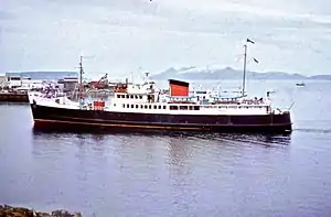 She developed a reputation with the press for mishap, with groundings in Kyle, Mallaig and off Longay.[3] The second of those, in 1966, left her high and dry for two days.[1] On 22 March 1973, she ran aground on Cleit Rock in the Sound of Gunna with CalMac General Manager and Chairman on board.[4] All passengers were safely taken off and she was towed to Gott Bay, Tiree. A bulkhead gave way when she was pumped out and she sank completely, blocking Tiree's only pier until 11 May. Floating crane, Magnus III lifted the former Stornoway mailboat onto the beach. She was patched, re-floated and towed to Troon for scrapping.[4]