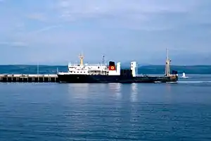 MV Pioneer was built to replace the smaller MV Arran between West Loch Tarbert and Port Ellen on Islay, in competition with unsubsidised Western Ferries. She was the longest vessel to operate this far up the loch. For ten years Pioneer rarely left the Islay roster.[1] In 1978 CalMac took over the Western Ferries terminal at Kennacraig, three miles down the loch, and in February 1979, Pioneer was replaced by the larger MV Iona. During a refit at Leith, her two cranes were removed and two side-loading ramps were connected to a large car hoist, for use at terminals without linkspans, allowing her to replace the ageing MV Bute as the Mallaig - Armadale ferry. Her bridge deck was extended and her bridge wings clipped to help with loading.[2]