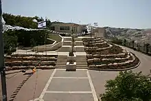 According to the Jerusalem Post, the site had served as a Nahal military outpost,[2] before being designated to become an Israeli labourers' camp. [7] The outpost's establishment was delayed for political reasons, despite the November decision. Yigal Allon was due to meet Henry Kissinger in Washington and any leak of a new settlement would have been inconvenient at that time. Galili said the timing for the setting up of camps on the site should coincide with Kissinger's movements, timing it so that the latter's shuttle diplomacy would find him in transit to Brussels.[17] Finally, around March 1975, following a ministerial decree to expropriate 3,000 hectares of land from the area's Palestinian villages,[18] forty members of Gush Emunim built a water tower and prefab concrete hut on the site, only to be evicted the same afternoon by Israeli troops, each prospective settler carried away by four soldiers. [19][20] This site was thereafter called by the settlers "Founder's Circle". [21][22] In 1977, Haim Sabato founded a hesder yeshiva (paramilitary field seminary)[23] there [24] and it was also designated to become a planned community, suburb and commuter town for nearby Jerusalem, to which many residents would commute daily. [25]