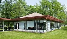 In 2001, the building was designated by the National Park Service as a National Historic Landmark because of its architecture. In its application to the National Park Service for protected status, the building is described as "significant as an early example of modern architecture in Columbus, and as an important example of the contextual work of John Carl Warnecke, a leading architect of the twentieth century."[3] The building is designed as a series of pods, connected by covered and trellised walkways. The major spaces in each pod (classrooms and other common spaces) are covered by individual pyramidal roof sections. The construction is steel framing on concrete slabs, with the walls finished in steel-clad glass and brick.[3]