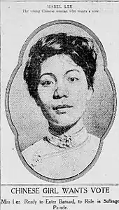 Mabel Ping-Hua Lee[2] (Chinese: 李彬华; October 7, 1896 – 1966) was a Chinese-American women's rights activist and minister who campaigned for women's suffrage in the United States. Later in life, Lee became a Baptist minister, working with the First Chinese Baptist Church in Chinatown.[3][4]