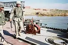There are a number of floating versions of the Mabey LSB in use across Iraq: Floating Piers which consist of steel Flexifloat pontoon units, Landing Piers consisting of 16 pontoon units, and Intermediate Piers which consist of 8 pontoons each. Hand winches are mounted on steel trays which are bolted to the pontoons. The anchors are connected to the hand winches and pontoons via steel chain and polypropylene ropes. Special span junction decks allow for the rotation of the floating spans as the spans deflect under live load.