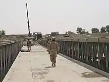 The Mabey Logistic Support Bridge (in the United States, the Mabey-Johnson Bridge) is a portable pre-fabricated truss bridge, designed for use by military engineering units to upgrade routes for heavier traffic, replace civilian bridges damaged by enemy action or floods etc., replace assault and general support bridges and to provide a long span floating bridge capability.[1] The bridge is a variant of the Mabey Compact 200 bridge, with alterations made to suit the military user as well as a ramp system to provide ground clearance to civilian and military vehicles.