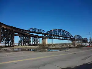 From 1929 through 1955, the MacArthur Bridge carried U.S. Highway 66[2] until the completion of the nearby Poplar Street Bridge. From 1947 to 1974, U.S. Highway 460 crossed the bridge, terminating on the west side of the bridge. In 1981 the bridge was closed to vehicles because of pavement deterioration and the eastern ramp approaches were torn out. The bridge is now in use only by railroads. The disused vehicle deck has been removed.