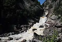 The floor of the MacDonald River valley is filled with terraced deltaic deposits formed by sedimentation in front of a decaying glacier.[17] One section of the lower river valley has many ridges and old meander arms, with crescent shaped sandbars covered with alders.[7] The MacDonald River cascade is associated with a glacial lock, or riegel, an area where the rock was more resistant to the movement of the glaciers. The cascade descends along a slope about 30 metres (98 ft) high. Traces of the glaciers are visible near the waterfall and further upstream, including polished surfaces, striations and grooves.[1]