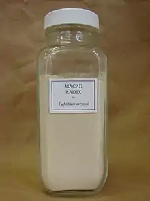 Lepidium meyenii, known as maca or Peruvian ginseng, is an edible herbaceous biennial plant of the family Brassicaceae that is native to South America in the high Andes mountains of Peru and Bolivia. It was found at the Meseta de Bombón plateau close to Lake Junin in the late 1980s.[1] It is grown for its fleshy hypocotyl that is fused with a taproot, which is typically dried, but may also be freshly cooked as a root vegetable. As a cash crop, it is primarily exported as a powder that may be raw, or processed further as a gelatinized starch or as an extract. If dried, it may be processed into a flour for baking or as a dietary supplement.