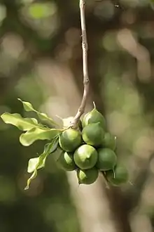 Macadamia is a genus of four species of trees in the flowering plant family Proteaceae.[1][2] They are indigenous to Australia, native to northeastern New South Wales and central and southeastern Queensland specifically. Two species of the genus are commercially important for their fruit, the macadamia nut /ˌmækəˈdeɪmiə/ (or simply macadamia). Global production in 2015 was 160,000 tonnes (180,000 short tons).[3] Other names include Queensland nut, bush nut, maroochi nut, bauple nut and, in the USA, they are also erroneously known as Hawaii nut.[4] In Australian Aboriginal languages, the fruit is known by names such as bauple, gyndl or jindilli[4] (north of Great Dividing Range) and boombera (south of the Great Range). It was an important source of bushfood for the Aboriginal peoples who are the original inhabitants of the area.