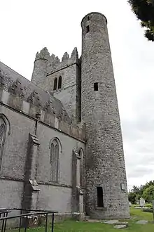 Samuel Lewis in his Topographical Dictionary of Ireland (1837) describes Lusk as "chiefly distinguished as the site of a monastery, over which St. Macculind, styled indifferently abbot or bishop, presided until his death in 497."[9] Lusk takes its name from the Irish Lusca, meaning "vault". The huge vault is below the round tower of Lusk, and holds the body of St. Macculindus, buried around 496, and about 18 bishops who succeeded him. The tower itself has six stories, each reached from below by an iron ladder.[10]
