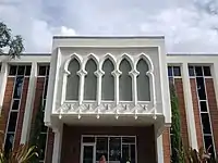 The architectural design of the building broadly falls under Mid-century modern, but may have been regionally influenced by the Sarasota School of Architecture, also known as Sarasota Modern. It is an open-plan structure, with large planes of glass that imbue the interior spaces with natural illumination. A distinctive feature of the building is its facade, a series of five Moorish arches, placed over the entrance that echoes the Moorish style of architecture of its neighboring iconic building, Plant Hall.