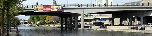 The Mackenzie King Bridge is a bridge over the Rideau Canal in Ottawa, Ontario, Canada. Just a few blocks away from Parliament Hill, south of the Plaza Bridge, it runs in a generally east–west direction, with the east end at the Rideau Centre and Department of National Defence Headquarters. The west end runs between the National Arts Centre and Confederation Park. It was named for William Lyon Mackenzie King (1874–1950), Canada's longest-serving prime minister[1] and was opened to traffic in 1951. A major restoration effort was completed in 1996–1998.