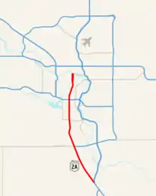 In November 2007, Calgary City Council approved a functional planning study for the portion of Macleod Trail that extends from Anderson Road north to Downtown. Expected recommendations include interchanges at Heritage Drive and Southland Drive, as well as possible traffic signal refinements.[4] In addition, three other interchange locations are planned to be constructed within ten years. They are at the intersection with Lake Fraser Gate, at the intersection with 162 Avenue, and at the intersection with 194 Avenue.[5][6] This would make Macleod Trail a freeway from Anderson Road to nearly the city limits. On August 13, 2017, the first diverging diamond interchange in Canada was opened at 162 Avenue.[7][8][9]