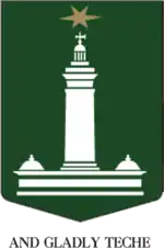 The escutcheon (in green taken from the tartan of Clan MacQuarrie) displays the Macquarie Lighthouse tower, the first major public building in the colony when completed in 1816, as well as the Sirius star (in gold), which was also the name of the flagship of the First Fleet. The motto chosen for the university, which following the rules of English heraldry does not form part of the original grant of arms, was And Gladly Teche, a phrase taken from the general prologue of The Canterbury Tales by Geoffrey Chaucer (circa 1400), and symbolises the university's commitment to both learning and teaching.[35]