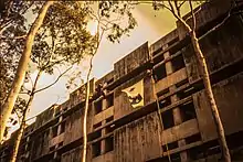 The initial concept of the campus was to create a new high technology corridor, similar to the area surrounding Stanford University in Palo Alto, California, the goal being to provide for interaction between industry and the new university.[8] The academic core was designed in the Brutalist style and developed by the renowned town planner Walter Abraham who also oversaw the next 20 years of planning and development for the university. A committee appointed to advise the state government on the establishment of the new university at North Ryde nominated Abraham as the architect-planner. The fledgling Macquarie University Council decided that planning for the campus would be done within the university, rather than by consultants, and this led to the establishment of the architect-planners office.[9]
