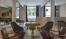 Macro Sea conceived G27 "as a veritable vertical campus, meaning that spaces for living, academic classes, dining and socializing are configured in a vertical fashion, creating a campus within a building."[20] The interior of G27 consists of contemporary, custom-made and vintage furniture of Bavarian and Danish origin. Many of the furnishings are repurposed local items and salvaged objects from the original facility. From a design perspective G27 is laid out to encourage interaction between students.[21] The campus orients around an open common room that contains a large fireplace and a marble bar and cafe. The residential portion of the building will house 200 people and the rooms and bathrooms are customizable.[22] G27 opened for the Fall 2015 semester and has been leased to the Council on International Educational Exchange.[23]