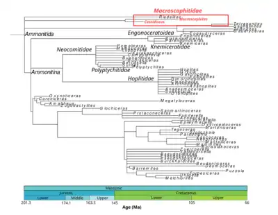 The Macroscaphitidae comprise a family in the subclass of Ammonoidea in the class of Cephalopoda in the phylum Mollusca. Due to their curious morphology multiple attempts to classify them into a superfamily were made. While the Macroscaphitidae were at first assigned to Hamitaceae in the 1950s,[4] this was revised in 2000 when they were classified as belonging to the superfamily Ancyloceratoidea.[5] However, in 2007 it was proposed to assign Macroscaphitidae to the superfamily Ptychoceratiodea,[6] where Macroscaphitidae still belong today.