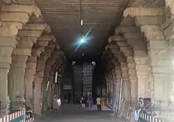 As per Hindu legend, Shiva appeared for a staunch devotee in the form of her mother to help her delivery. To quench her thirst, Shiva is believed to have split his toe nail that resulted in a spring in the form of Siddhamritha tank.[1] As per local legend, the Nayak king Thirumalai Nayak suffered from stomach pain and he arrived at Madavar Vilagam in an ivory palanquin and stayed there for 48 days. He was completely cured and as a mark of his gratitude, he constructed the Natarajar hall as in Madurai Meenakshi temple.[2] He also built drum halls from the temple to Madurai as he would take his midday meal only after hearing the drum sounds indicating the completion of mid day worship in the temple.[3] There are many inscriptions in the temple from the Pandya dynasty and Thirumalai Nayak indicating various grants to the temple. The Pandya inscriptions refer the temple name as Thirukkattralishvaram Udaiyar.[1]
