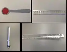 The Maddox rod test can be used to subjectively detect and measure a latent, manifest, horizontal or vertical strabismus for near and distance. The test is based on the principle of diplopic projection.[1] Dissociation of the deviation is brought about by presenting a red line image to one eye and a white light to the other, while prisms are used to superimpose these and effectively measure the angle of deviation (horizontal and vertical). The strength of the prism is increased until the streak of the light passes through the centre of the prism, as the strength of the prism indicates the amount of deviation present. The Maddox rod is a handheld instrument composed of red parallel plano convex cylinder lens, which refracts light rays so that a point source of light is seen as a line or streak of light.[2] Due to the optical properties, the streak of light is seen perpendicular to the axis of the cylinder.[3]