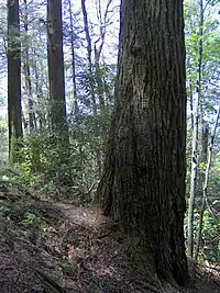 Albright Grove is a rare old growth example of a cove hardwood forest, one of the most diverse forest types in North America.[6] Most of the large hardwood trees in the Smokies were cleared by logging operations or killed by blights in the first half of the 20th century. While Albright Grove suffered through the various blights and infestations, it was never intensively logged. Hemlock and poplar trees dominate the grove, although fraser magnolia, basswood, and beech are not uncommon.[7] Some of the trees are over 200 years old.[8]