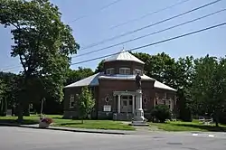 The Madison Public Library is an L-shaped one-story brick building featuring one of the most unusual compositions in Maine. This distinction derives from the arrangement of the wide projecting entrance block that projects from the angled rectangular wings. Rising above the intersection of these three components is an octagonal tower capped by a similarly configured standing seam metal roof. The building stands on a corner lot near the community's commercial district.