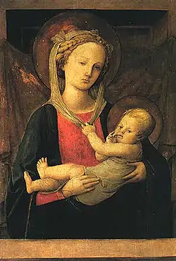 Madonna and Child is a c. 1450–1455 tempera on panel painting by Filippo Lippi, now in the Magnani-Rocca Foundation in the Province of Parma in Italy.[1] It is strongly influenced by Flemish works, particularly in the trompe-l'œil marble banister and the drape over the dark background.[2] It also shows some similarities to the work of the Master of the Castello Nativity, who is thought to have been an assistant in Lippi's workshop.