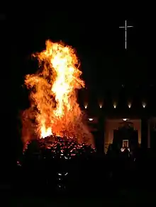 Since 1870, on 26 April at dusk the so-called focaracci[20] are kindled in all the town districts. They are devotional bonfires in honour of the Madonna di Pietraquaria, similar to the Beltane bonfires. Around them popular and religious songs and small music concerts are performed.[21] According to a legend the tradition of focaracci arose from a dispute between the populations of Avezzano and Cese about whom merited the Virgin's protection. From the top of Mount Salviano the Madonna turned towards the city of Avezzano to look at the bonfires that were lit by Avezzanese people in order to draw her attention.[22]