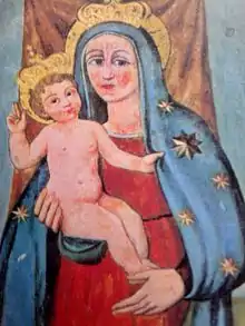 The Madonna is depicted standing, dressed in red with a blue coloured, star-studded mantle; she supports the Jesus Child with her right arm while keeping his feet with the palm of her left hand. The Child appears naked while blessing with the three fingers of his right hand and gently keeping a hem of his mother's mantle. Following the coronation occurring in 1838, two golden diadems were placed upon the statue.[16]