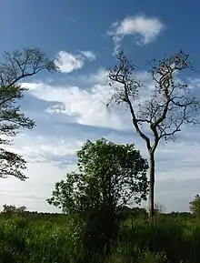 The park lies entirely in the dry zone although the park's southern boundary is near the intermediate zone.[2] The climax community of the area is tropical dry mixed evergreen forests characterized by Drypetes sepiaria, Chloroxylon swietenia, Manilkara hexandra, Pterospermum canescens, wood apple Feronia limonia, Cassia fistula, and Dimorphocalyx glabellus. However a majority of the forests within the park had been severely exploited for shifting cultivation. This has effected in secondary forests and vast stretches of open plains dominated by grasses. The herbaceous stage is succeeded by shrubs and the thicket stage is characterized by Trema orientalis. Among the first trees to appear is Pterospermum canescens, Drypetes sepiaria, and Manilkara hexandra. Maduru Oya Dam is surrounded by parkland, kept by periodic fires. A number of woody plants occur around the reservoir.[3] A rare and endemic tree Vatica obscura, the only Dipterocarpaceae species to occur in the dry zone, is found in limited locations on the banks of the Maduru Oya and Gallodai Aru. Exotic teak Tectona grandis is included in the north-eastern region of the park.[2]