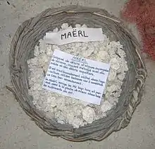Maerl (also rhodolith) is a collective name for non-geniculate coralline red algae with a certain growth habit.[1] Maerl grows at a rate of c. 1 mm per year.[2] It accumulates as unattached particles and forms extensive beds in suitable sublittoral sites.[3] The term maerl originally refers to the branched growth form of Lemoine (1910)[4] and rhodolith is a sedimentological or genetic term for both the nodular and branched growth forms (Basso et al., 2015).[5]