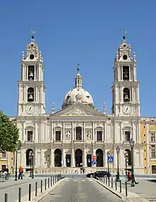 Located 40 km northwest of Lisbon,[11] The Mafra Royal Building and adjacent property, was conceived by King John V (D. João V) in 1711 as a tangible representation of his idea of monarchy and State. This imposing quadrangular building houses the king and queen's palaces, a royal chapel shaped like a Roman baroque basilica, a Franciscan monastery and an impressive library containing 36,000 volumes.[12] The complex is completed by the Cerco garden,[13] with its geometric layout and the royal hunting park and grounds (Portuguese: Tapada de Mafra[14]).