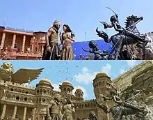 The film's principal photography was expected to begin on 26 February 2008,[27] and then on 15 March 2008, but finally began on 19 March 2008 in Rajasthan.[12][28] Initial shooting occurred for 10 days in Rann of Kutch, Gujarat.[18] Art director Ravinder went to Chennai and gave details of their requirements to a prominent chariot-making specialist. After rejecting the maker's first iron skeletons, Ravinder opted to design them himself, and prepared three models of chariots with different heights to be used, depending on the camera's location and other technical requirements. He used fibre material for the iron skeleton's exteriors. For a scene in which neither the hero nor the villain was present on the chariot, Ravinder measured a short person and designed a hidden chamber in which he could sit and secretly control the horses. While the chariot race sequence was shot in Dholavira, the sequence in which the chariot sinks in quicksand was shot at a set comprising three acres in Ramoji Film City.[29]