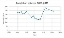 According to the 2011 Census, Magdalen Laver had a population of 232 usual residents.[4] As shown in the table below, Magdalen Laver was subject fluctuating population numbers between 1801–1901 which may be due to changes to census boundary areas during that time. From 1931 to 1961 the population consistently, which in part may be due to more farmers moving into the area due to support the agricultural output needed to sustain Great Britain's efforts during and post World War 2.