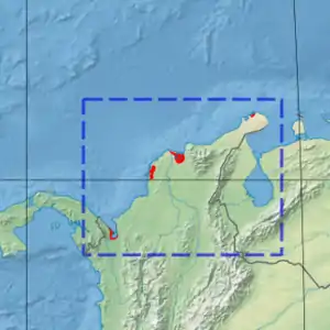 The Magdalena-Santa Marta mangroves ecoregion (WWF ID:NT1417) covers the mangrove forests along the coast of Colombia on the Caribbean Sea, from Gulf of Urabá in the west at the Colombia-Panama border to the Guajira Peninsula in the east.[1][2] [3] The region is relatively dry, with low precipitation and high evapotranspiration, so the mangroves depend for water and nutrients on the rivers flowing across the estuarine plain from the Sierra Nevada de Santa Marta mountains to the east. Efforts are currently underway to restore mangroves degraded by development and road building from the 1950s to 1980s.[3]