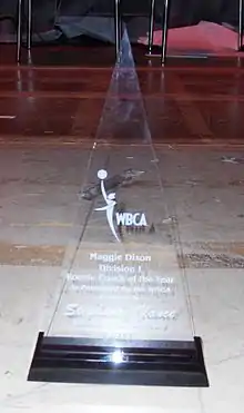 The Maggie Dixon Division I Rookie Coach of the Year Award is an award given annually since 2007 to the head coach in women's college basketball in the NCAA Division I competition who achieves great success in their first year as a Division I head coach. Given by the Women's Basketball Coaches Association (WBCA), the award is named for former women's head coach Maggie Dixon, who coached at Army for the 2005–06 season before suddenly dying due to valve complications from an enlarged heart.[1] Dixon had been named head coach just 11 days before the start of the season but led the Black Knights to a 20–11 record and won the Patriot League tournament championship.[2] It was Army's first basketball team, men or women, to play in the NCAA Tournament. Although Army would lose in the first round to Tennessee, Dixon was named the Patriot League Coach of the Year and received much praise from the college basketball community for her coaching job in just her first season. On April 6, 2006, Dixon died at the age of 28 to what her brother Jamie Dixon, then head men's basketball coach at Pittsburgh, described as an "arrhythmic episode to her heart."[2]
