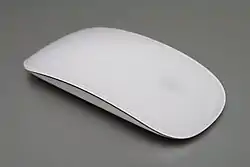 The Magic Mouse is a multi-touch wireless mouse that is manufactured by Foxconn and sold by Apple Inc.. The first-generation Magic Mouse was released on October 20, 2009, and introduced multi-touch functionality to a computer mouse.[1][2] Taking after the iPhone, iPod Touch, and multi-touch MacBook trackpads, the Magic Mouse allows the use of multi-touch gestures and inertia scrolling across the surface of the mouse, designed for use with macOS.