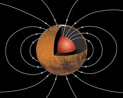 The magnetic field of Mars is the magnetic field generated from Mars' interior. Today, Mars does not have a global magnetic field. However, Mars did power an early dynamo that produced a strong magnetic field 4 billion years ago, comparable to Earth's present surface field. After the early dynamo ceased, a weak late dynamo was reactivated (or persisted up to) ~3.8 billion years ago. The distribution of Martian crustal magnetization is similar to the Martian dichotomy (i.e., the Martian hemispheric topographic dichotomy). Whereas the Martian northern lowlands are largely unmagnetized, the southern hemisphere possesses strong remanent magnetization, showing alternating stripes. Our understanding of the evolution of the magnetic field of Mars is based on the combination of satellite measurements and Martian ground-based magnetic data.
