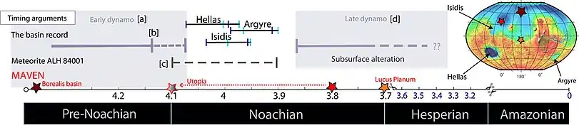 The exact timing and duration of the Martian dynamo remain unknown, but there are several constraints from satellite observations and paleomagnetic studies. The strong crustal magnetization in the southern hemisphere and the paleomagnetic evidence of ALH84001 indicate that Mars sustained a strong magnetic field between ~4.2–4.3 Ga. The absence of crustal magnetic signatures in the upper lowlands and large impact basins implies dynamo termination prior to the formation of these basins (~4.0–3.9 Ga). Magnetic anomalies from two young volcanoes (e.g., Tyrrhenus Mons, Syrtis Major) may reflect the presence of a Martian magnetic field with possible magnetic reversals during the late Noachian and Hesperian period.[4]