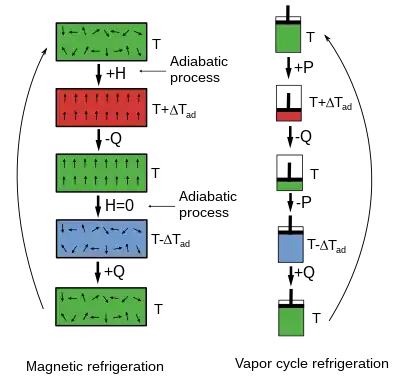 Analogy between magnetic refrigeration and vapor cycle or conventional refrigeration. H = externally applied magnetic field; Q = heat quantity; P = pressure; ΔTad = adiabatic temperature variation